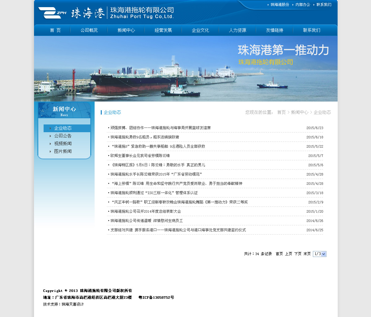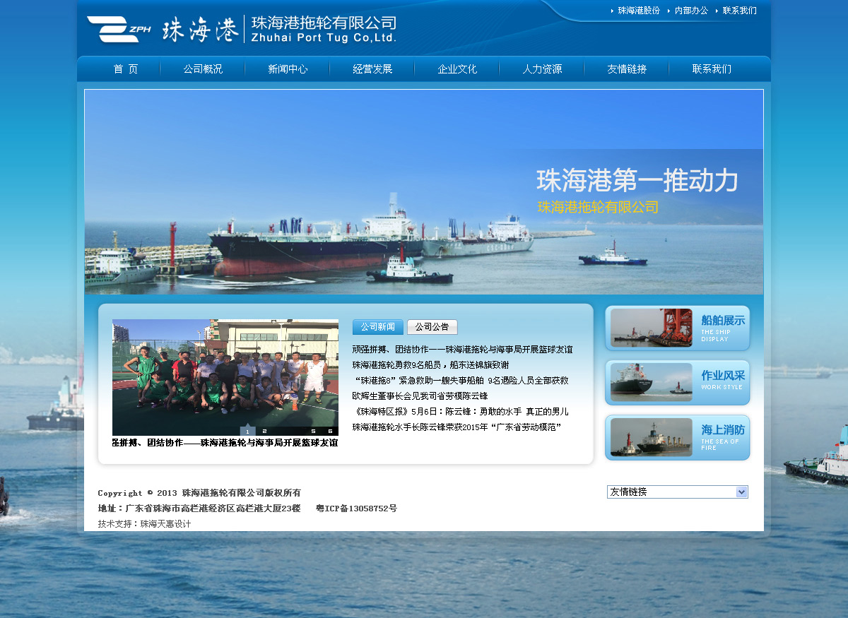 珠海港拖輪有限公司成立于1994年,是珠海港股份有限公司的全資子公司,注冊資金5000萬元,是一家集船舶拖帶、監護、港口工程、碼頭、河流疏浚工程于一體的綜合性企業。公司主要經營珠海港至廣東省沿海各港間航線,經營港口的港作及拖帶、監護業務;同時還兼有海上搜救、搶險及港口船舶消防等公益性服務,是珠海目前唯一一家從事拖輪拖帶的企業。公司現有全回轉港作拖輪5艘,其中4艘拖輪具有拖消兩用,最大馬力5000P,最小2600P,根據公司的發展規劃至2015年,公司的拖輪艘數將達到6--7艘;公司自有拖輪碼頭已在2010年投入使用。
